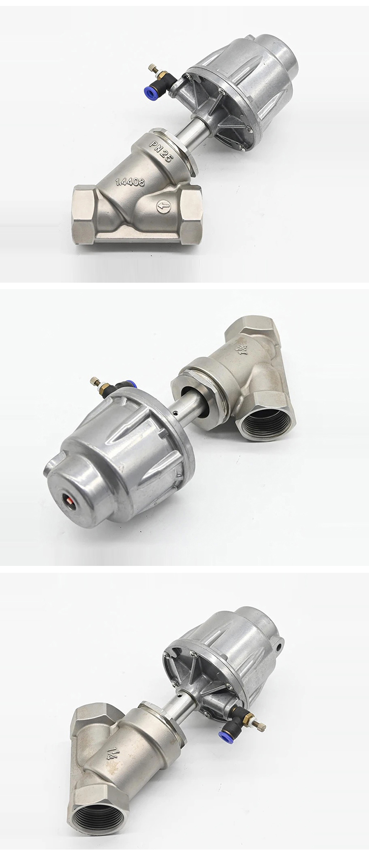 The angle seat valve maintains the flow rate to save space. It uses a single-acting pneumatic actuator with spring safety to operate the steering angle seat valve. When used, it should be normally open or normally closed.The product is made of stainless steel and Teflon. It can be used in most gases, liquids, steam and corrosive applications. It has a radiator to protect the actuator, It ensures a long life of the valve.