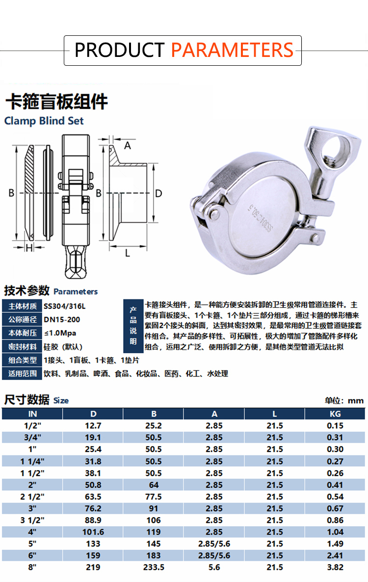 Products Name:YOULI Hygienic Food Sanitary Stainless Steel 304 SS316L DIN SMS 3A Tri-clamp Pipe Fitting Complete Sets Clamp Ferrule Blind