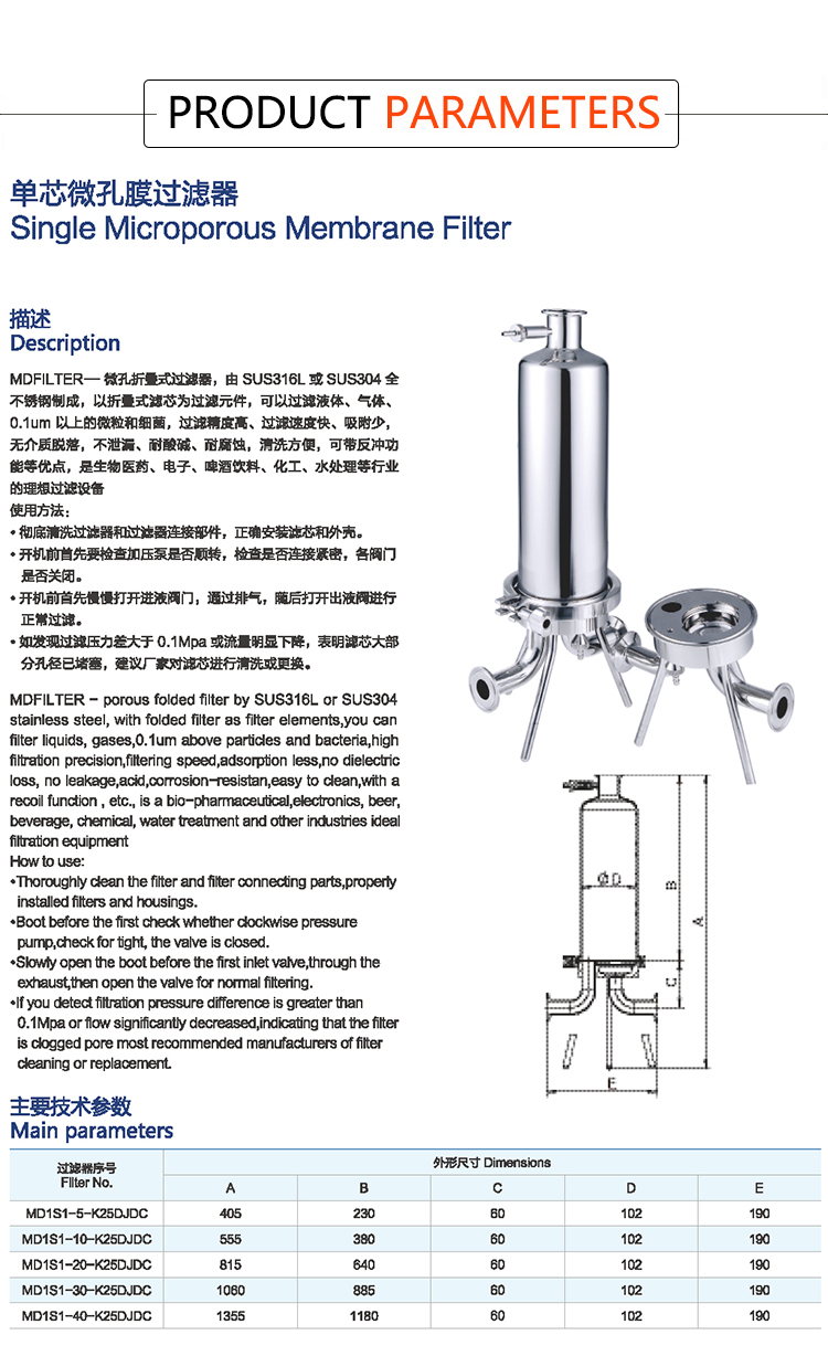 | 1 | 304 | 5" K50.5MM | $102.03 | 3.4kg | Single filter element |