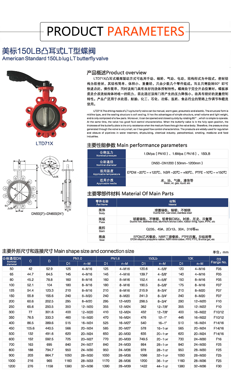 Products Name:YOULI Stainless Steel ANSI 150LB 304 316 JIS 10K Pn10-16 Cast Iron PTFE EPDM Soft Sealing Water Manual Wafer Lug Butterfly Valve