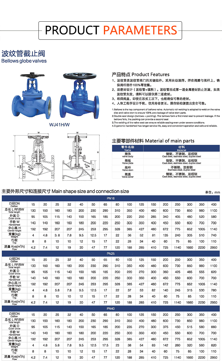 Products Name:YOULI High Temperature Steam Gas Zero Leakage ANSI 150LB PN16-40 304 316 Stainless Steel WCB Bellow Seal Flanged Globe Valve