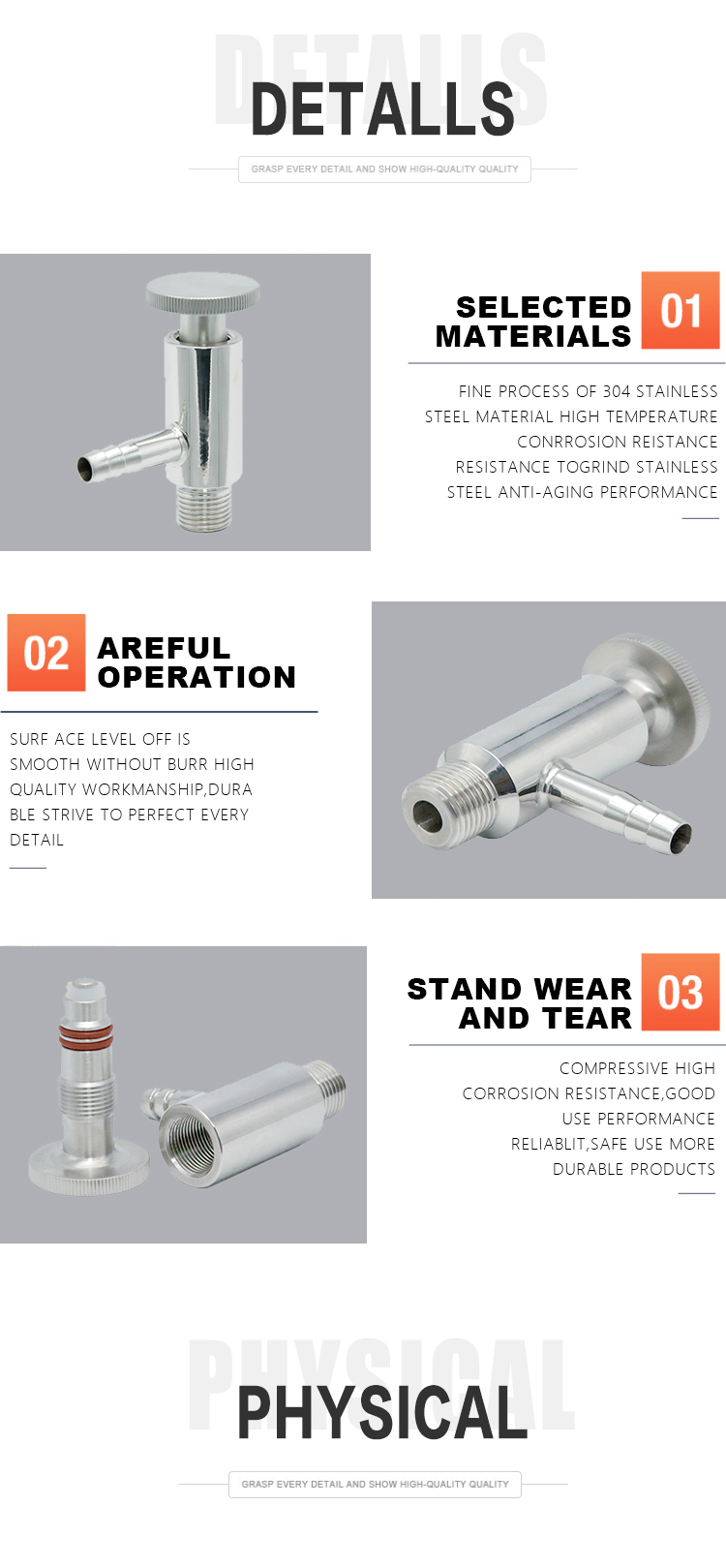 Its mainly applied to extract sample from tank or pipeline. It also can be assembled at the bottom of the tank or pipeline to drain away the remains.It is apply for the food, chemical, pharmaceutical, cosmetics and biotechnology industries. As well as all other sectors requiring sanitary type equipment.