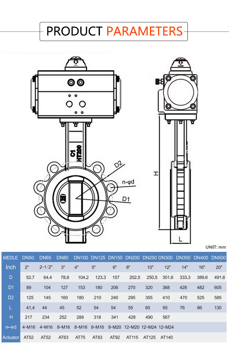 Products Name:YOULI Stainless Steel ANSI 150LB 304 316 Cast Iron JIS 10K Pn10-16 WCB PTFE Pneumatic Actuator Lug Butterfly Valve