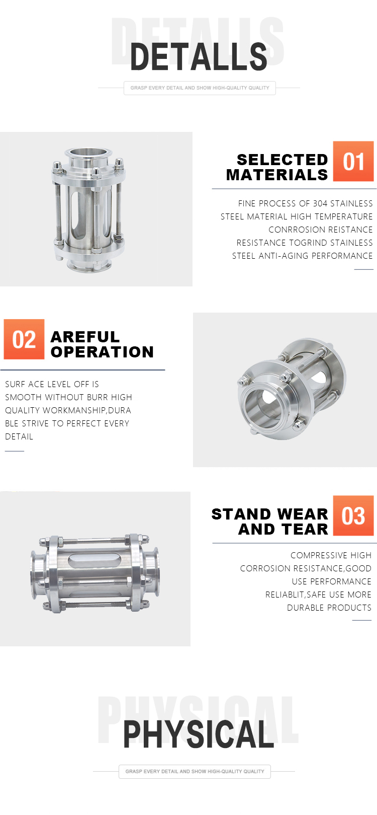 It is used to provide 360-degree viewing of material flow in a line.The unit is available in sanitary connection from 3/4" to 6" sizes,and can be supplied with a protective tubing of polycarbonate tubing, acrylic tubing,or slotted stainless steel,depending on temperature requirements.Sanitary Straight Sight Glass allows observation of fluids in transit through a three-dimensional pipeline.