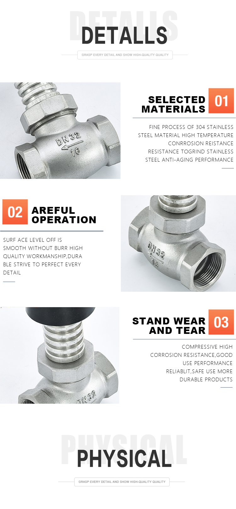 | Body material | SUS201,SUS304,SUS316(CF8M),SUS 304L(CF8),SUS 316L(CF3M),WCB,Brass,etc. |