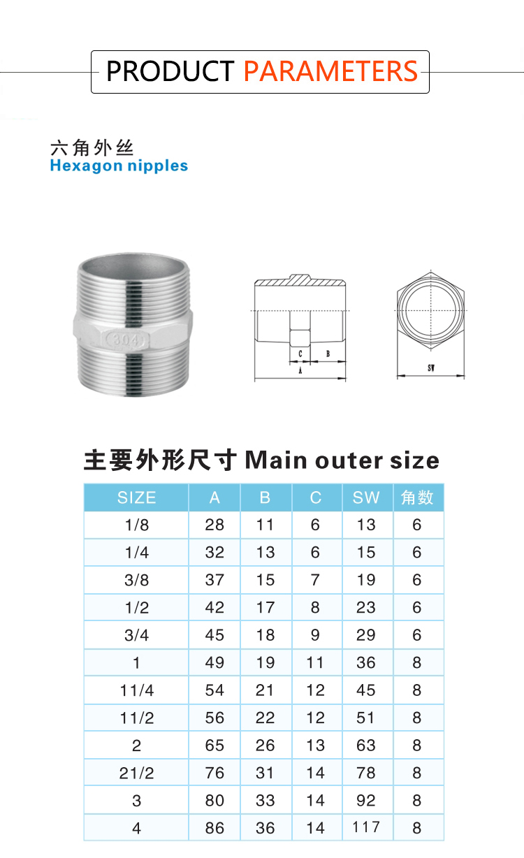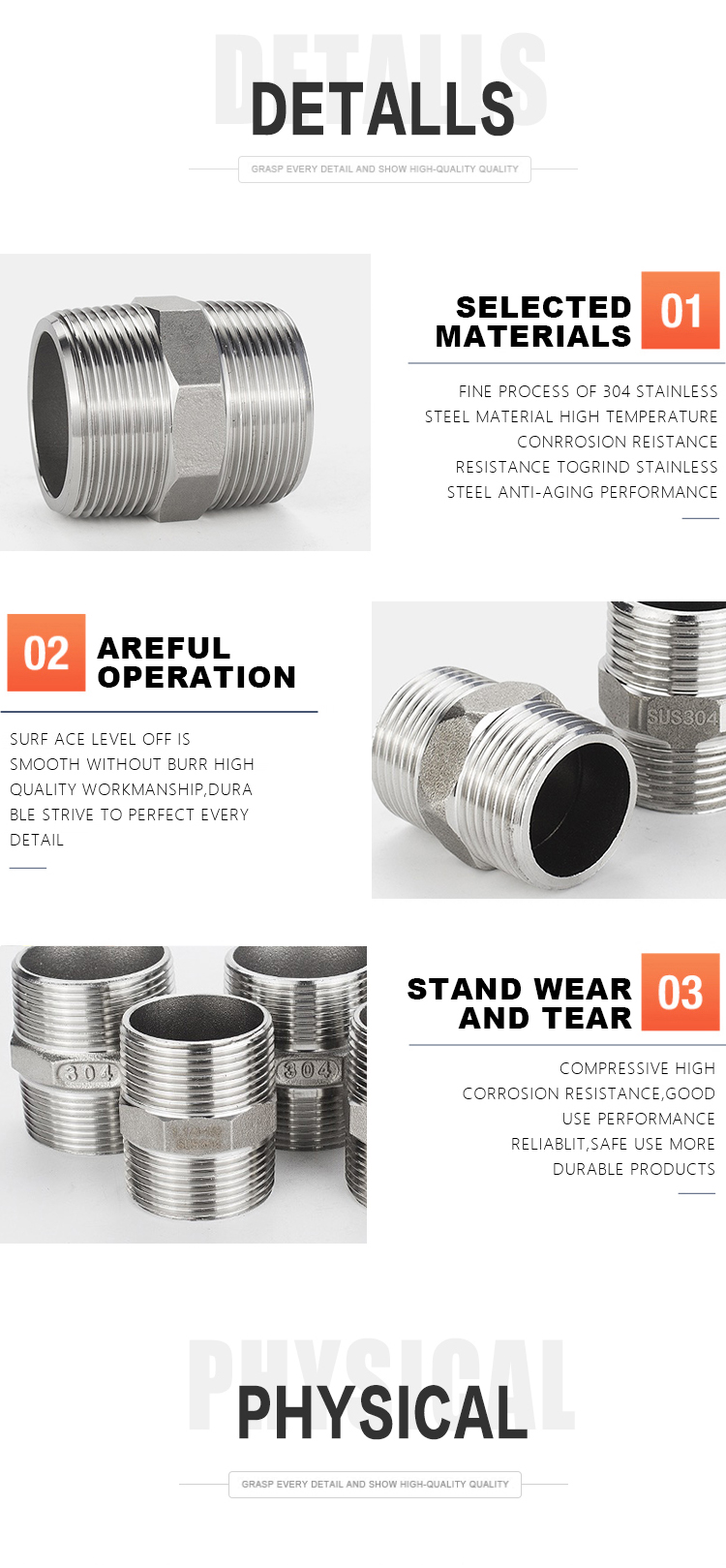 Products Name:YOULI Stainless Steel 304 SS316L BSP NPT Pipe Fitting Hexagonal Double Male Threaded Ferrule