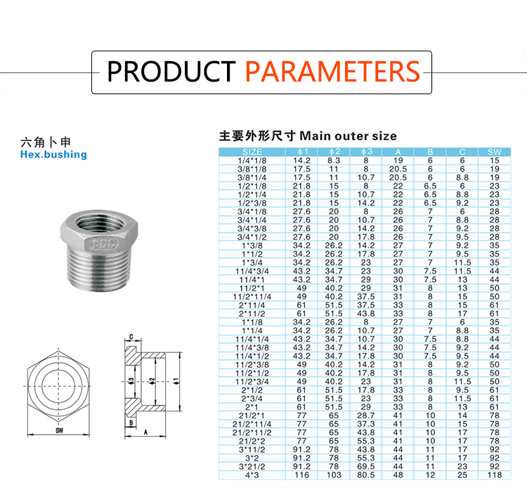 Products Name:YOULI Stainless Steel 304 SS316L BSP NPT Pipe Fitting Hexagonal Reducing Threaded Bushing