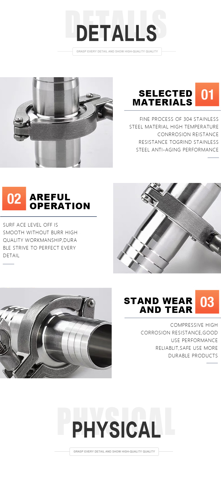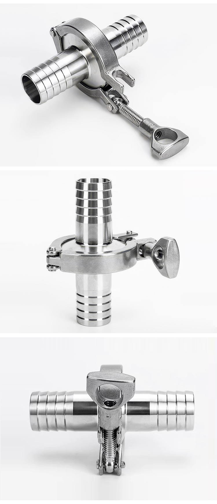 The clamp quick coupling joint consists of a male and a female part. When in use, insert the male part into the female part. Then, apply a clamp around the joint. The clamp exerts pressure, compressing a sealing element between the two parts. This creates a tight seal, preventing leakage of fluid or gas. The design allows for quick and easy connection and disconnection, making it highly convenient for various applications.