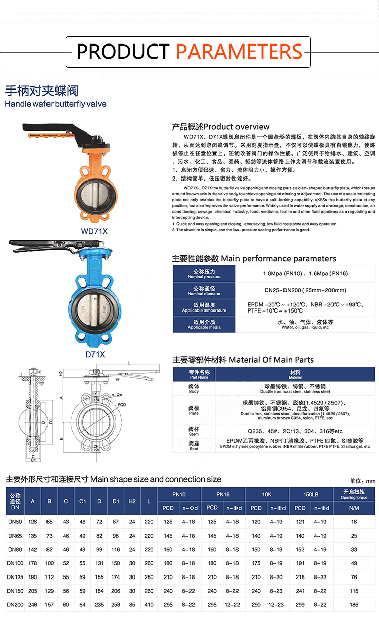 Products Name:YOULI Stainless Steel ANSI 150LB 304 316 JIS 10K Pn10-16 Cast Iron PTFE EPDM Soft Sealing Water Manual Wafer Butterfly Valve