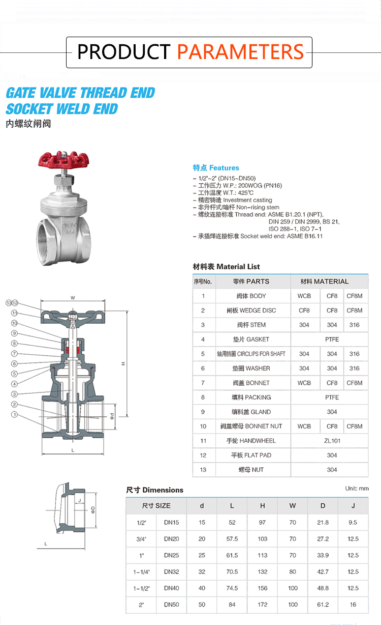 Products Name:YOULI High Quality High Temperature Z15W 200wog Pn16 Stainless Steel 304 316 BSP NPT Female Threaded Gate Valve