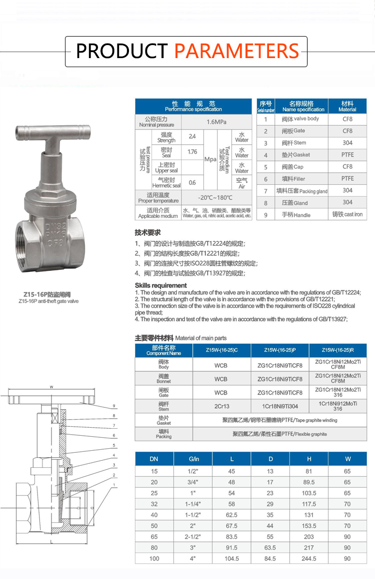 Products Name:YOULI Durable Z15W PN16 200wog Stainless Steel 304 316 RC BSP NPT Anti Theft Lock Manual Female Threaded Gate Valve