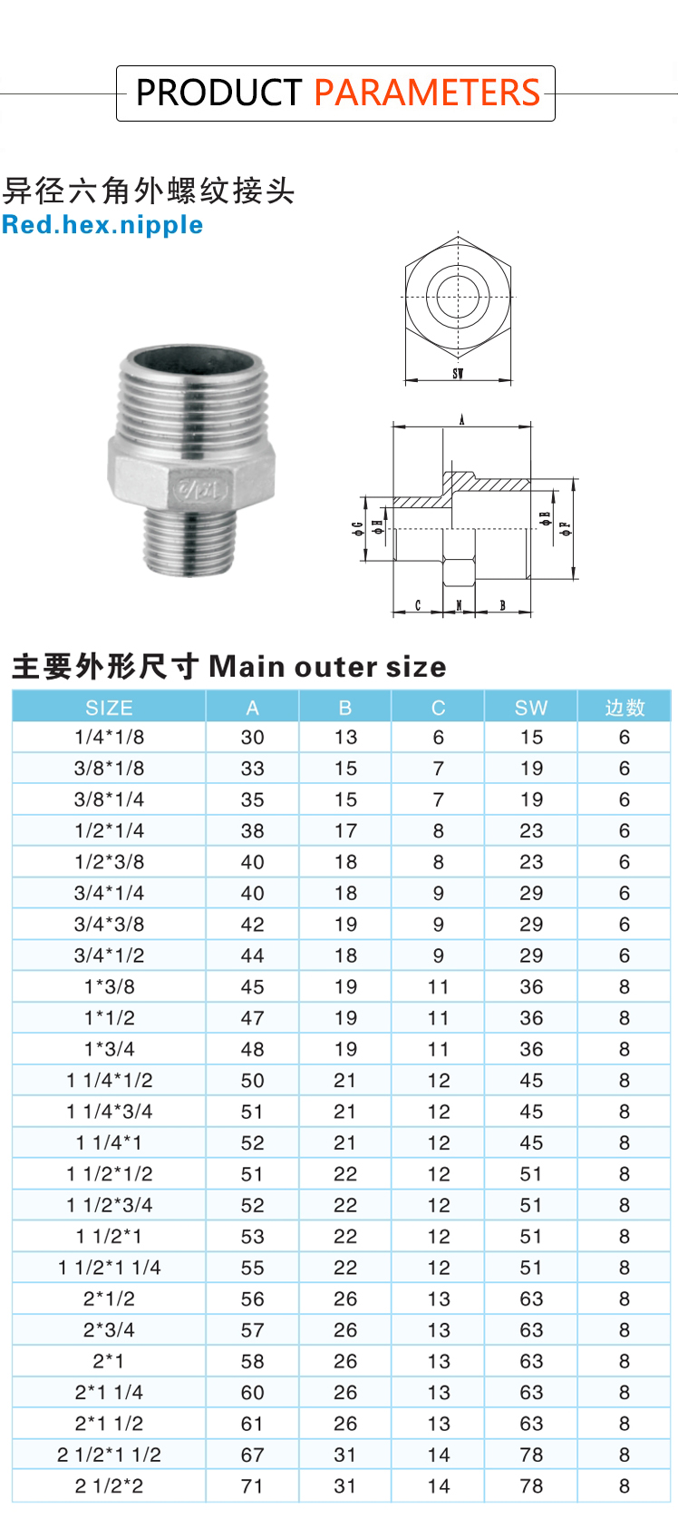 Products Name:YOULI Stainless Steel 304 SS316L BSP NPT Pipe Fitting Reducing Hexagonal Double Male Threaded Ferrule